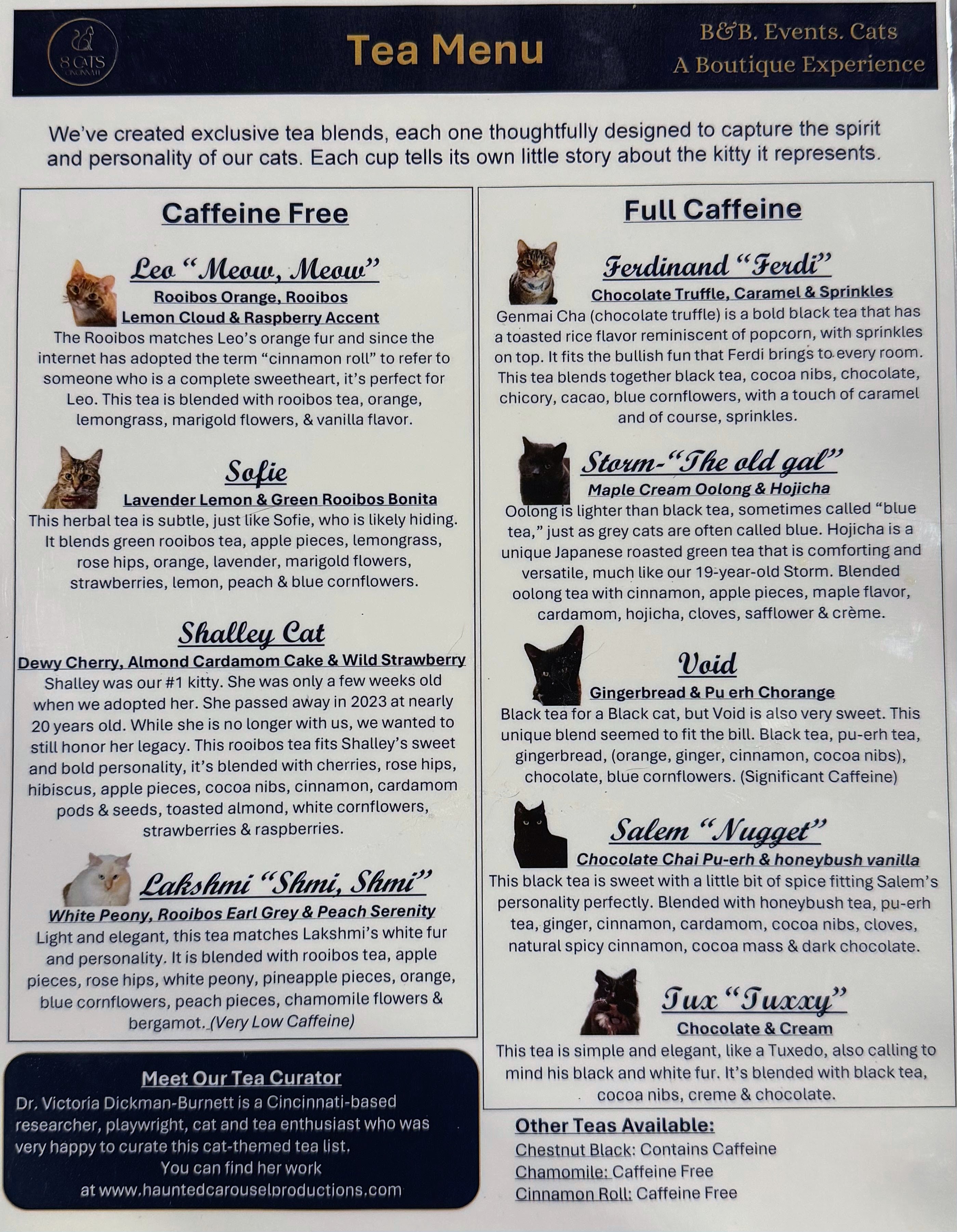Our tea menu was curated by Cincinnati-based tea enthusiast Dr. Victoria Dickman-Burnett, who helped bring each of these playful, cat-inspired blends to life.
